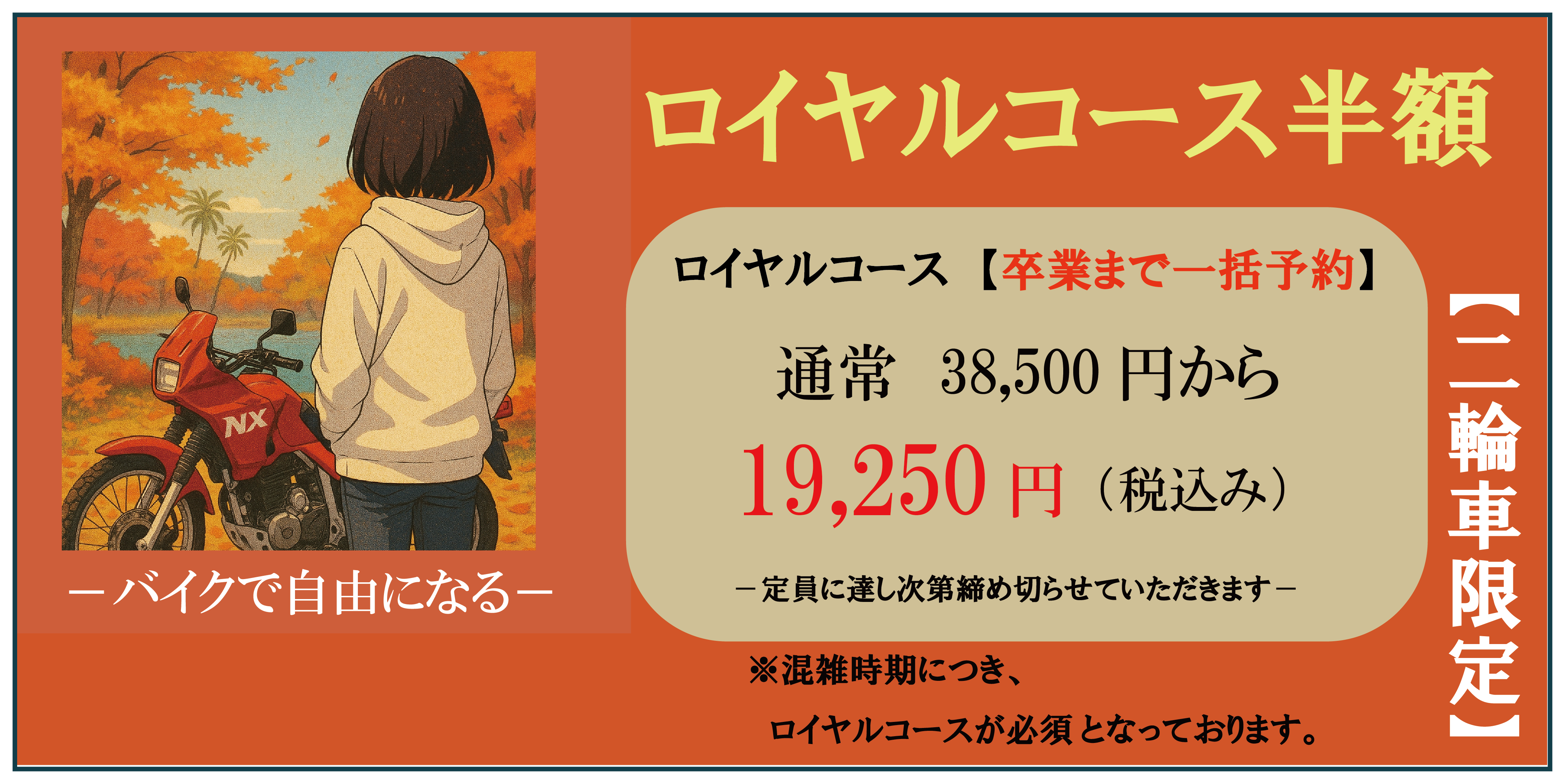 16歳以上 ※誕生日3ヶ月前から入校できます。 ※大型自動二輪は(普通二輪免許所持の方で)18歳以上からです。 |